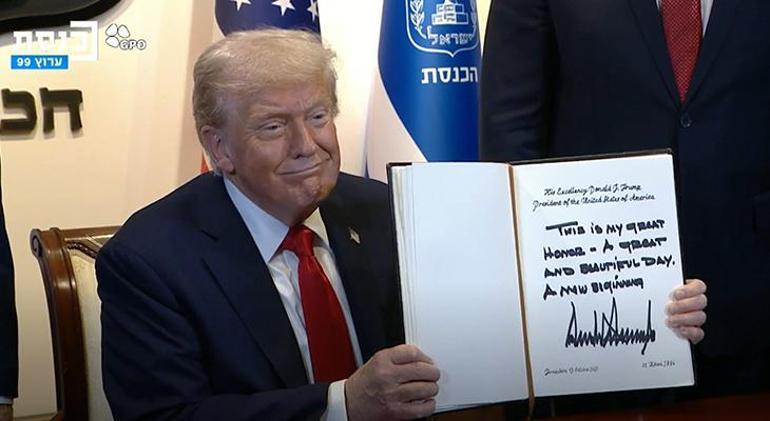 ABD Başkanı Trump, İsrail Meclisi'nde konuşma yapmadan önce hatıra defterini imzalayarak "Bu benim için büyük bir onur. Harika bir gün ve yeni bir başlangıç" ifadelerini kullandı.
