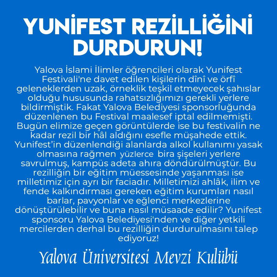 YUNİFEST adı ile Yalova Belediyesinin sponsorluğunda düzenlenen festivalde yaşanan rezillik eğitim müessesesi olması gereken üniversitelerin ne hale geldiğiniz gözler önüne serdi. Festivale davet edilen kişilerin ise bu toprakların dinine ve örfüne aykırı kimseler olduğu gözden kaçmadı.