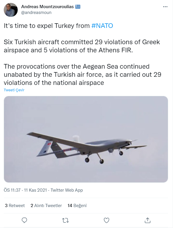 Yunan gazeteci Andreas Mountzouroulias, sosyal meyda hesabından yaptığı bir paylaşımda, “Türkiye’yi NATO’dan kovmanın vakti geldi. Altı Türk uçağı 29 Yunan hava sahası ve 5 Atina FIR ihlali gerçekleştirdi. Ege Denizi üzerindeki provokasyonlar, ulusal hava sahasını 29 kez ihlal eden Türk hava kuvvetleri tarafından hız kesmeden devam etti.